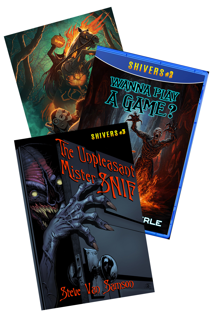 New Shivers Holiday Special! From October to December 20th you can buy The Sleepy Hollow Gang by Robert P. Ottone signed and lettered deluxe hardcover edition with slipcase, You Wanna Play A Game signed and lettered deluxe hardcover edition with slipcase, and The Unpleasant Mister Snif by Steve Van Samson signed and lettered hardcover edition with slipcase for only $100, and free shipping in CONUS! While supplies last. There are only 5 sets available at this price!